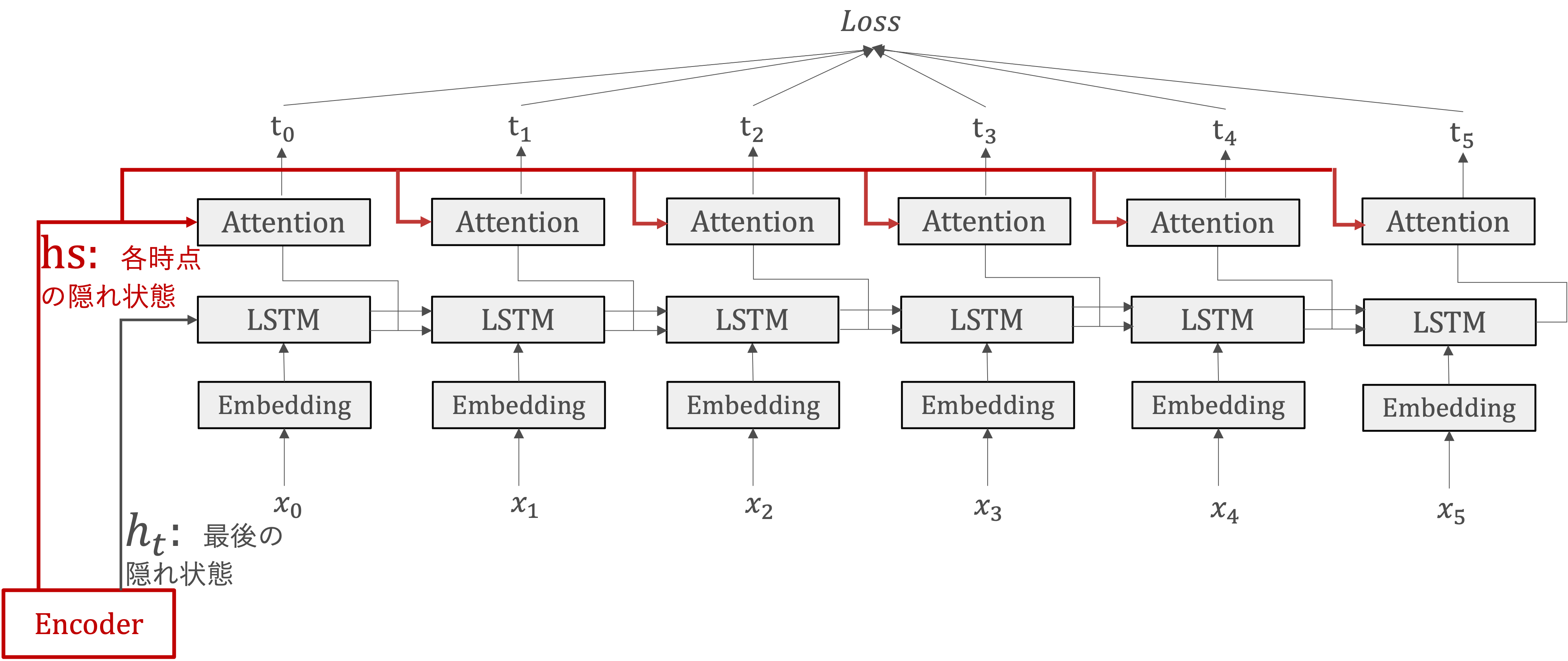 Atention機構では、EncoderのLSTMライヤの各時点の隠れ状態()を受け取ります。