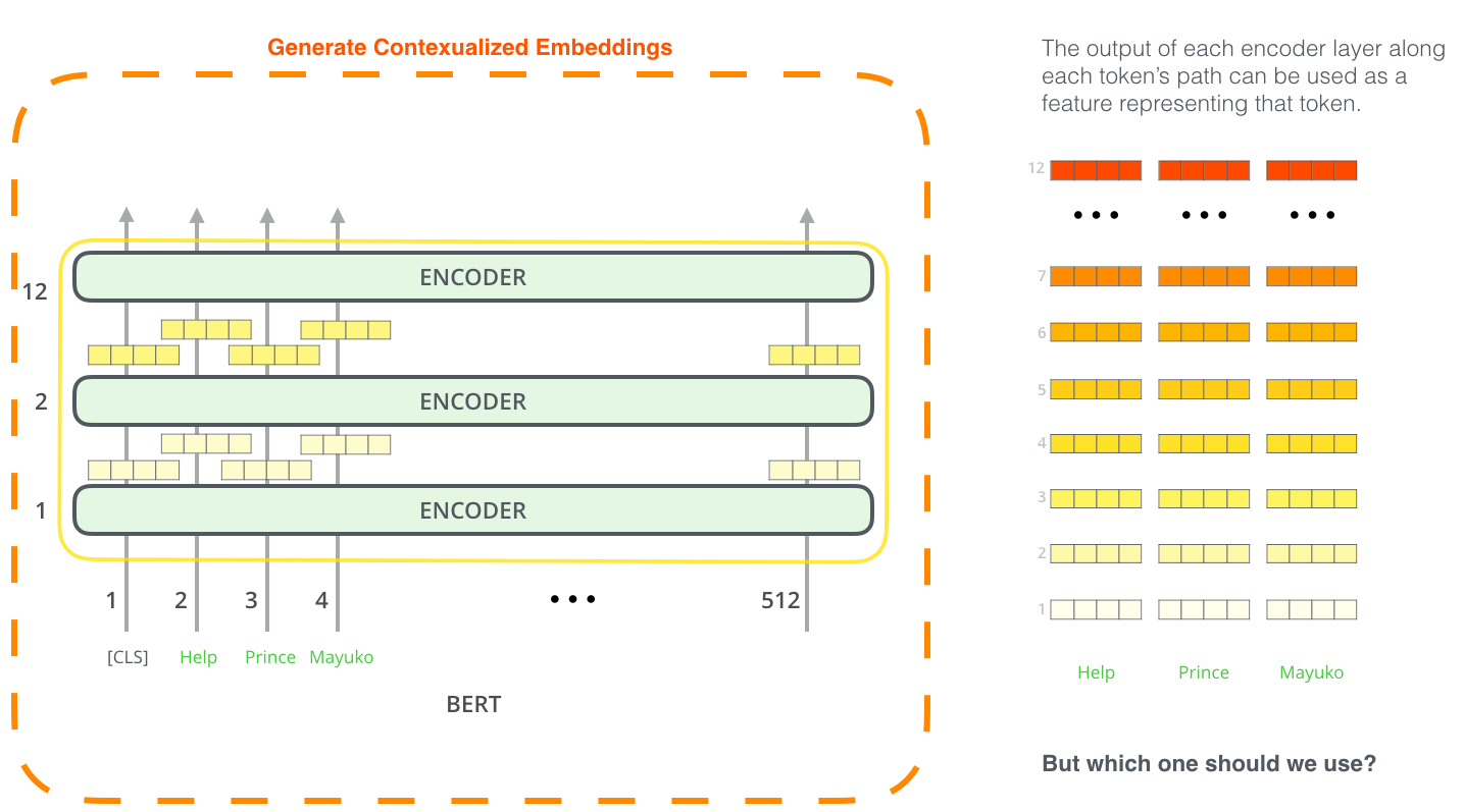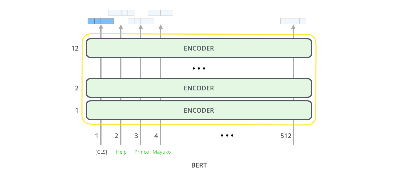 例えば、テキスト分類の場合、追加層としては、BERTの最後の隠れ層からの出力に冒頭のSpecial token[CLS]を全結合層(Dense Layer)に経由し、各カテゴリーに属する確率を出力します。それは、[CLS]トークンは入力テキスト全体の文脈情報を集約すると考えるためです。