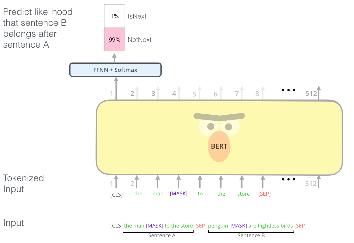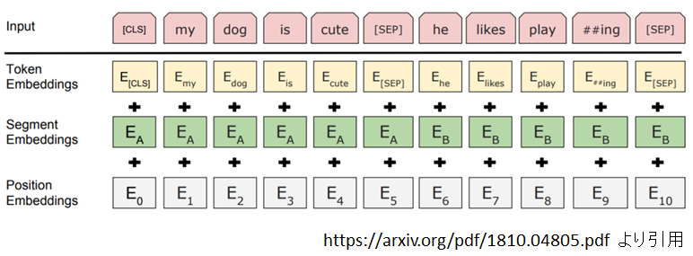 まとめると、BERTの入力埋め込みは、トークン埋め込み、位置埋め込み、segment埋め込みより加算されます。