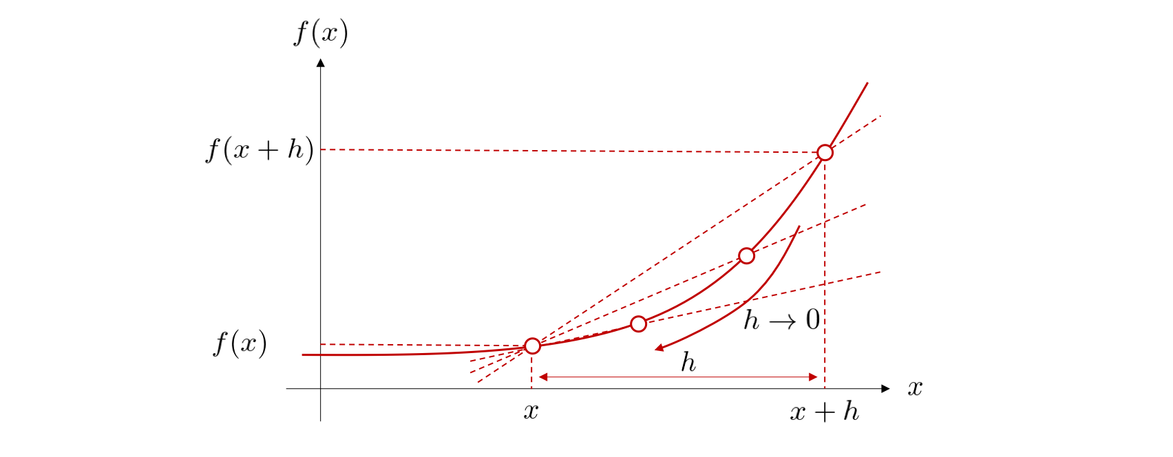 a=(x+h)−xf(x+h)−f(x) 次にhをh→0のように小さくしていけば、直線の開始点と終了点の2点が1点に収束し、1点での接線として考えることができます。このように、平均変化率の極限値が存在するならば、微分可能であると言います。この式をfの導関数 (derivative)と呼び、f′(x)と書きます。関数f(x)の微分係数f′(a)はその曲線の点(a,f(a))(接点)における接線の傾きです。