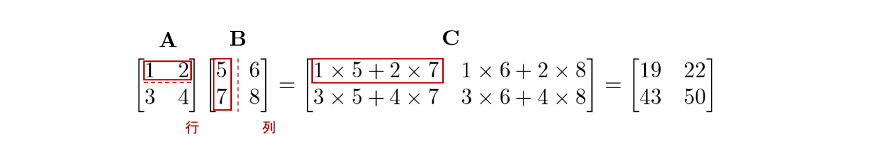 例えば、行列Aの1行目の行ベクトルと、行列Bの1列目の列ベクトルの内積の結果は、AとBの行列積の結果を表す行列Cの1行1列目に対応します。
