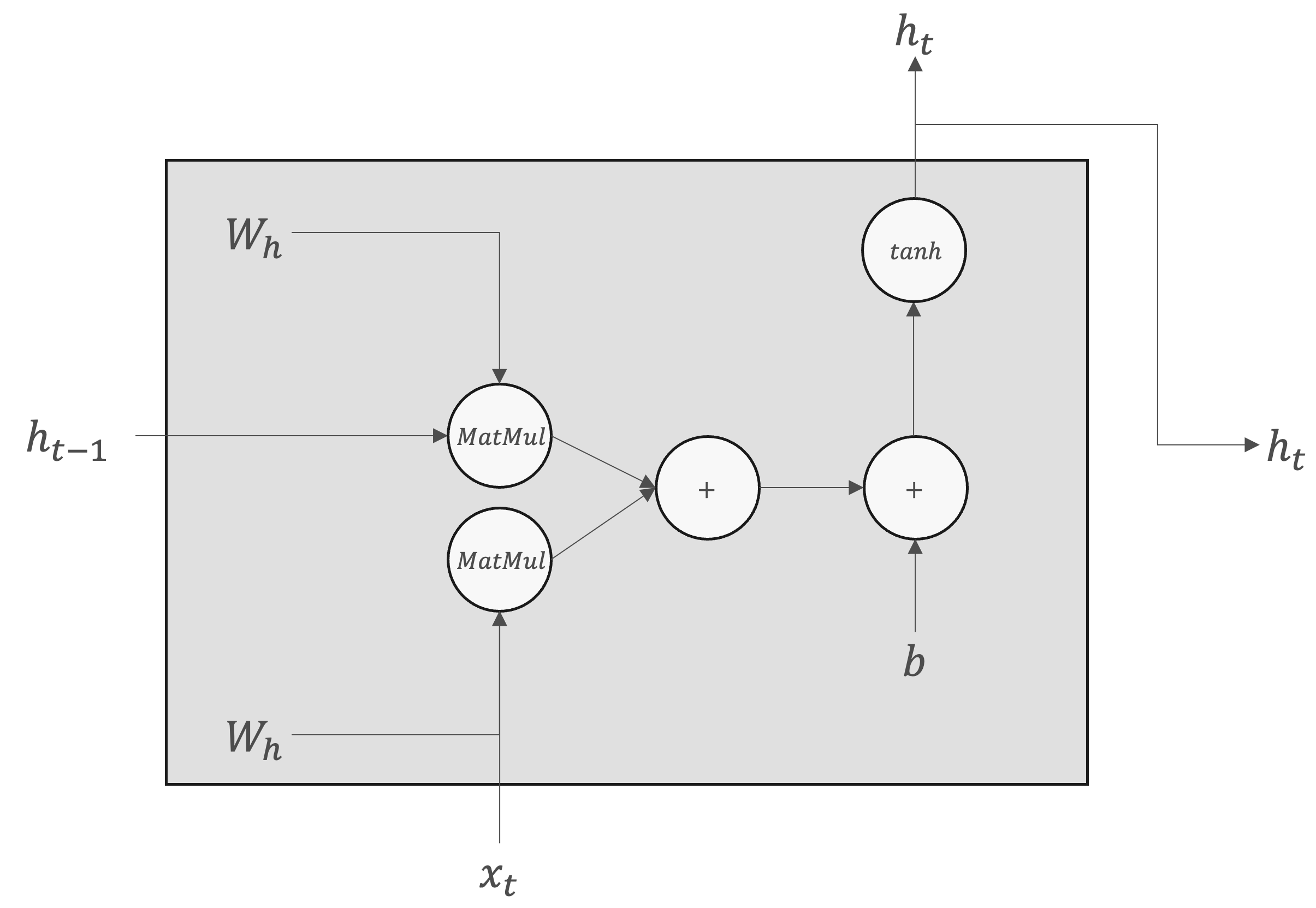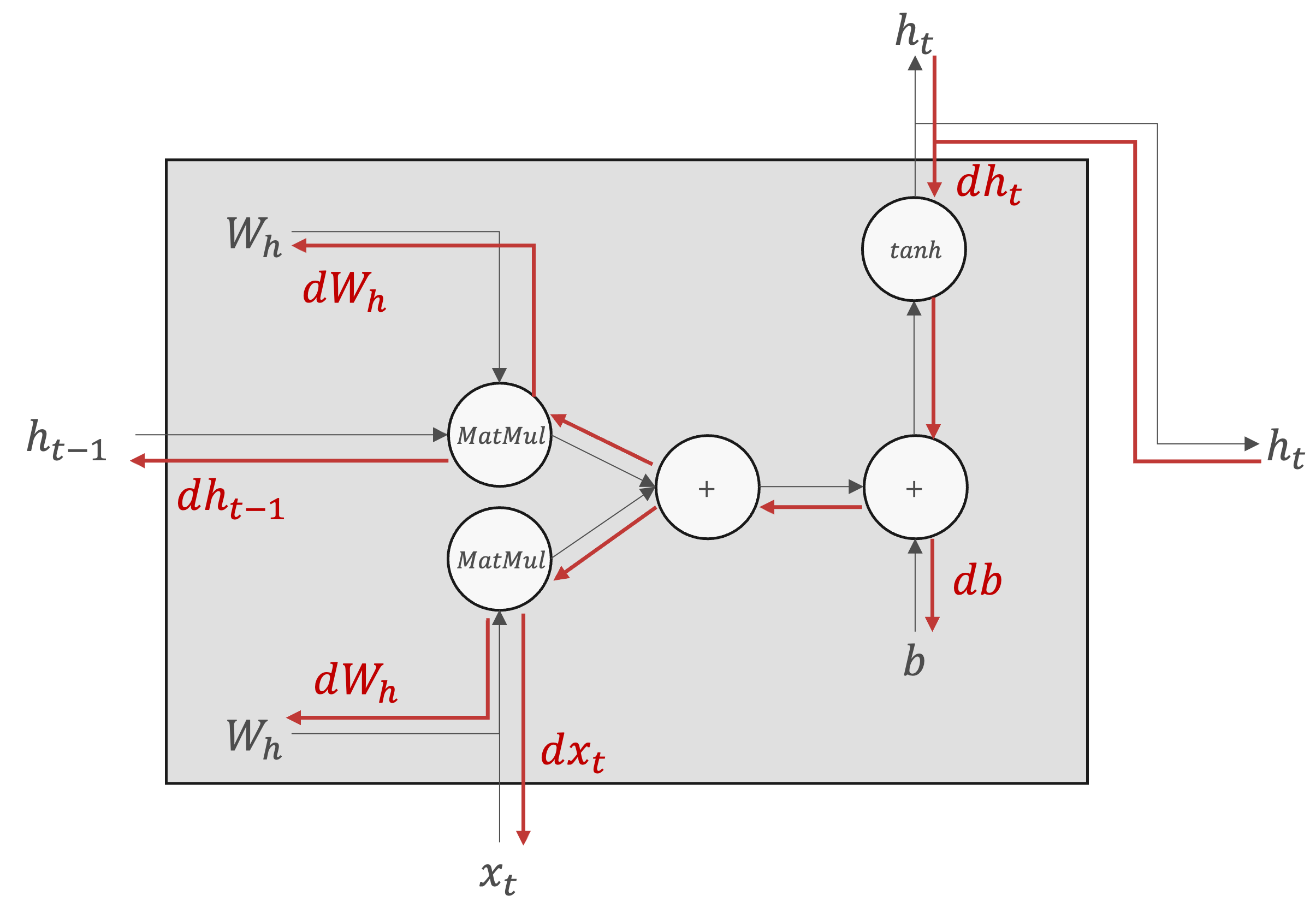 RNNレイヤの順伝播と逆伝播は以下の計算グラフで示されます。