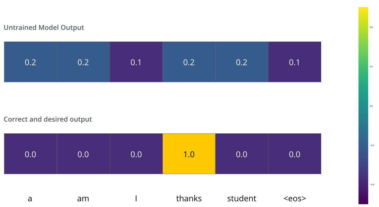 エンコーダ・デコーダでは、エンコーダに入力されるトークン列からを順に予測されるように学習します。ここで、までを予測した状態のとき、学習はとからトークンを予測できるようにモデルを更新していくことで行われます。