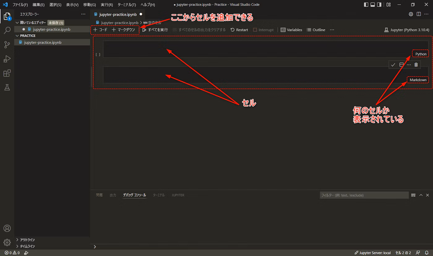 Jupyterにはコマンドモードとエディットモードがあります。セルをダブルクリックするか、選択して