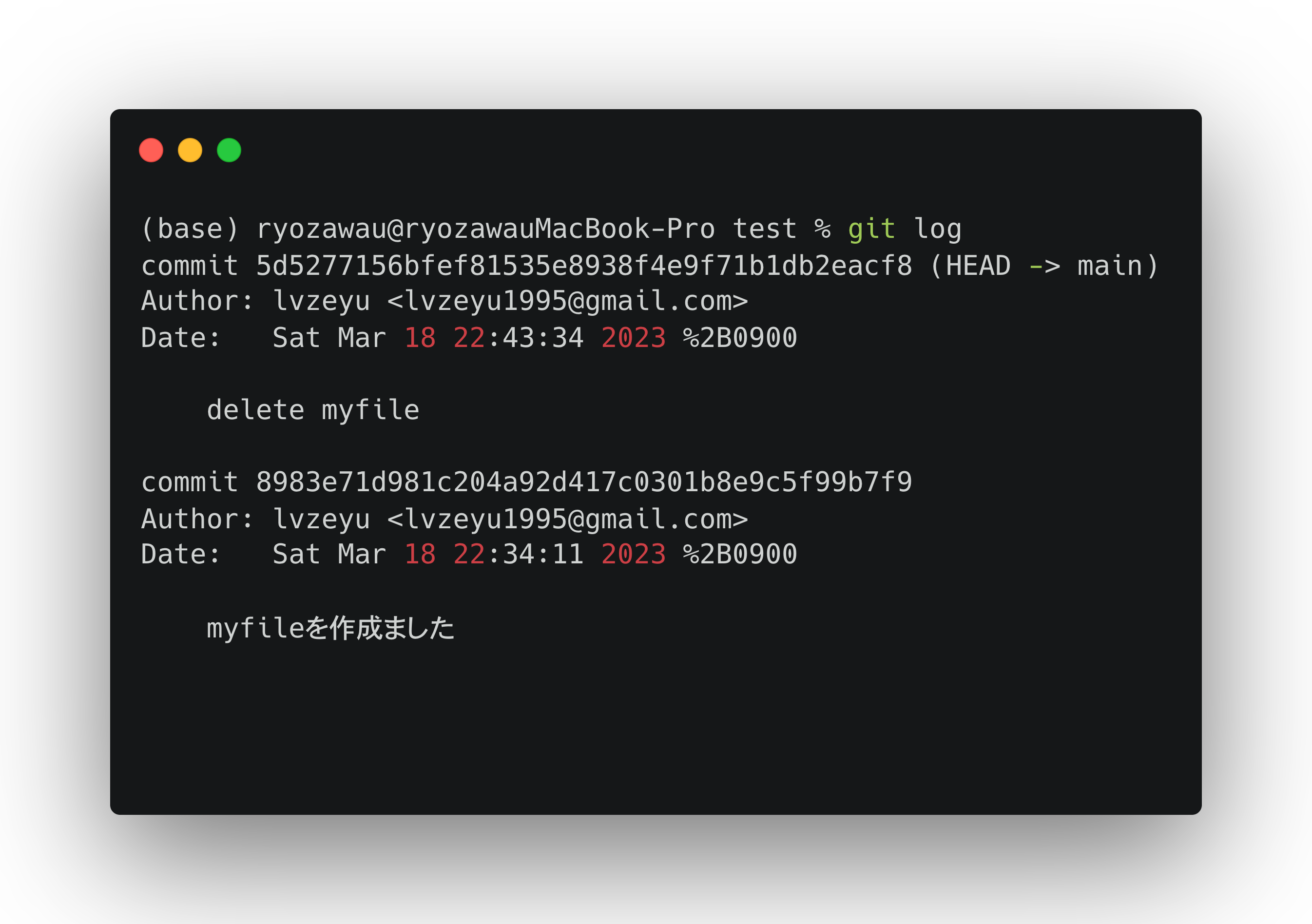 仮に、myfile.txtを削除し、コミットした操作を行いましたが、実はこのファイルは捨ててはいけないファイルだったと気ついたとします。