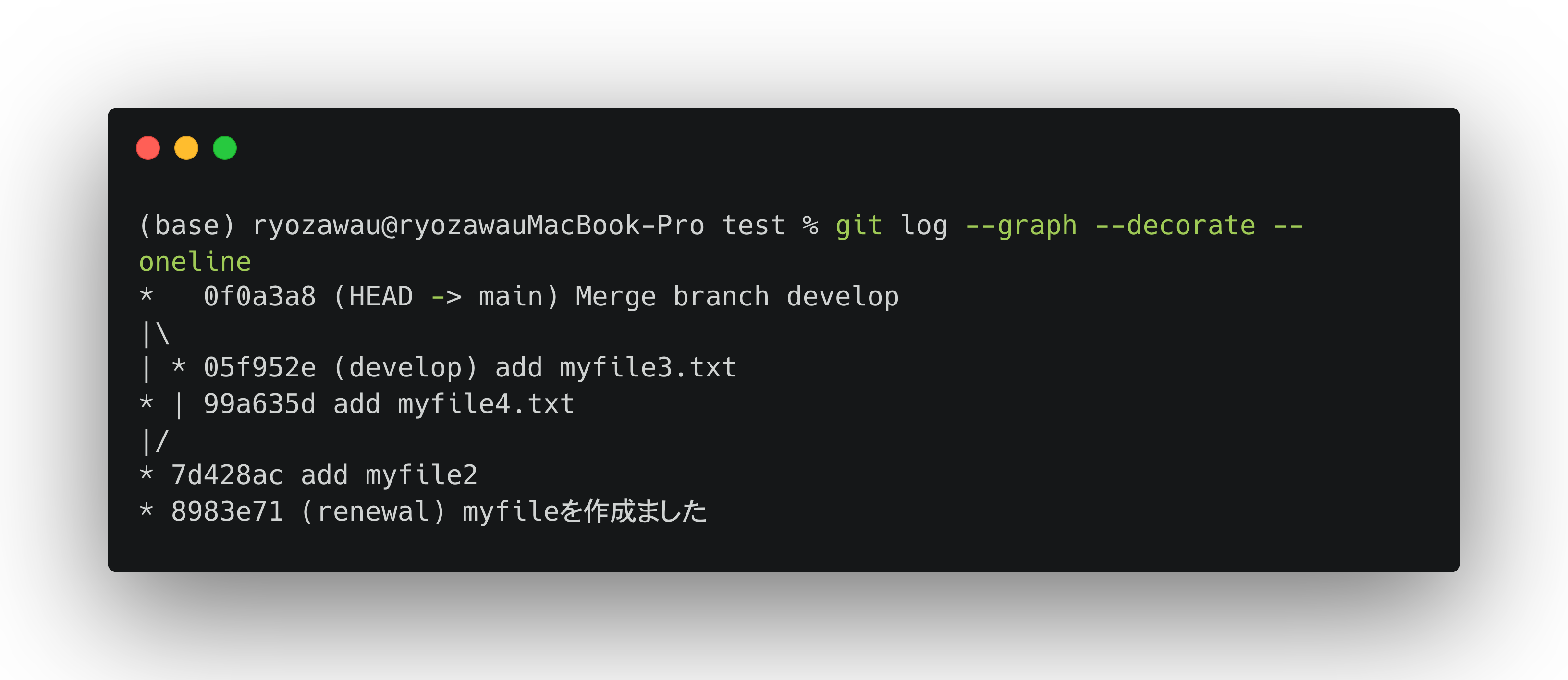 git branchで現在main/masterブランチにいることを確認します。マージを実行します。