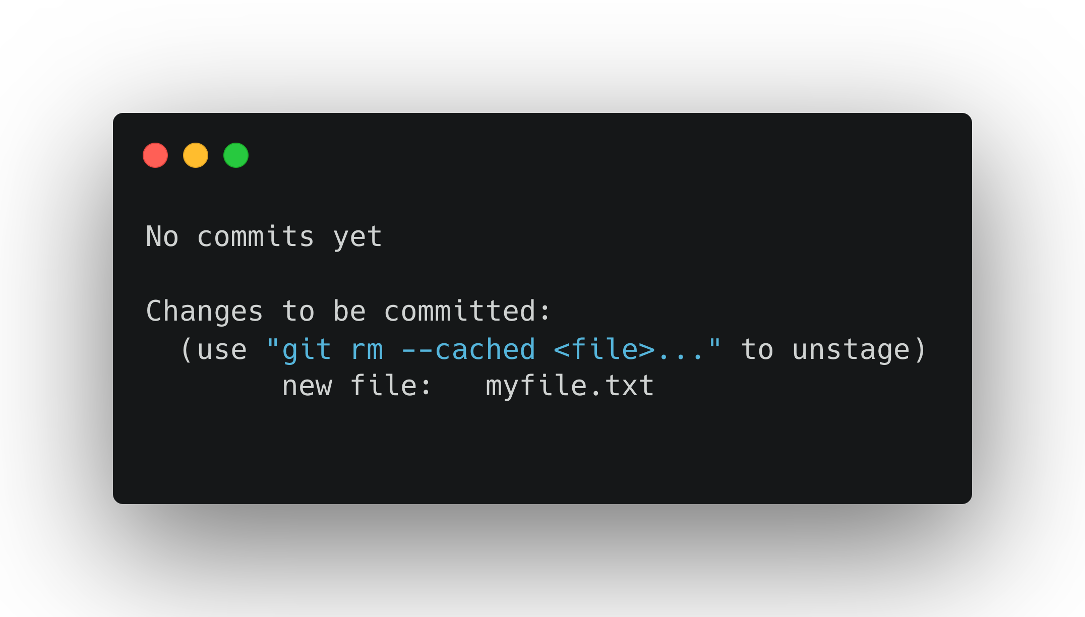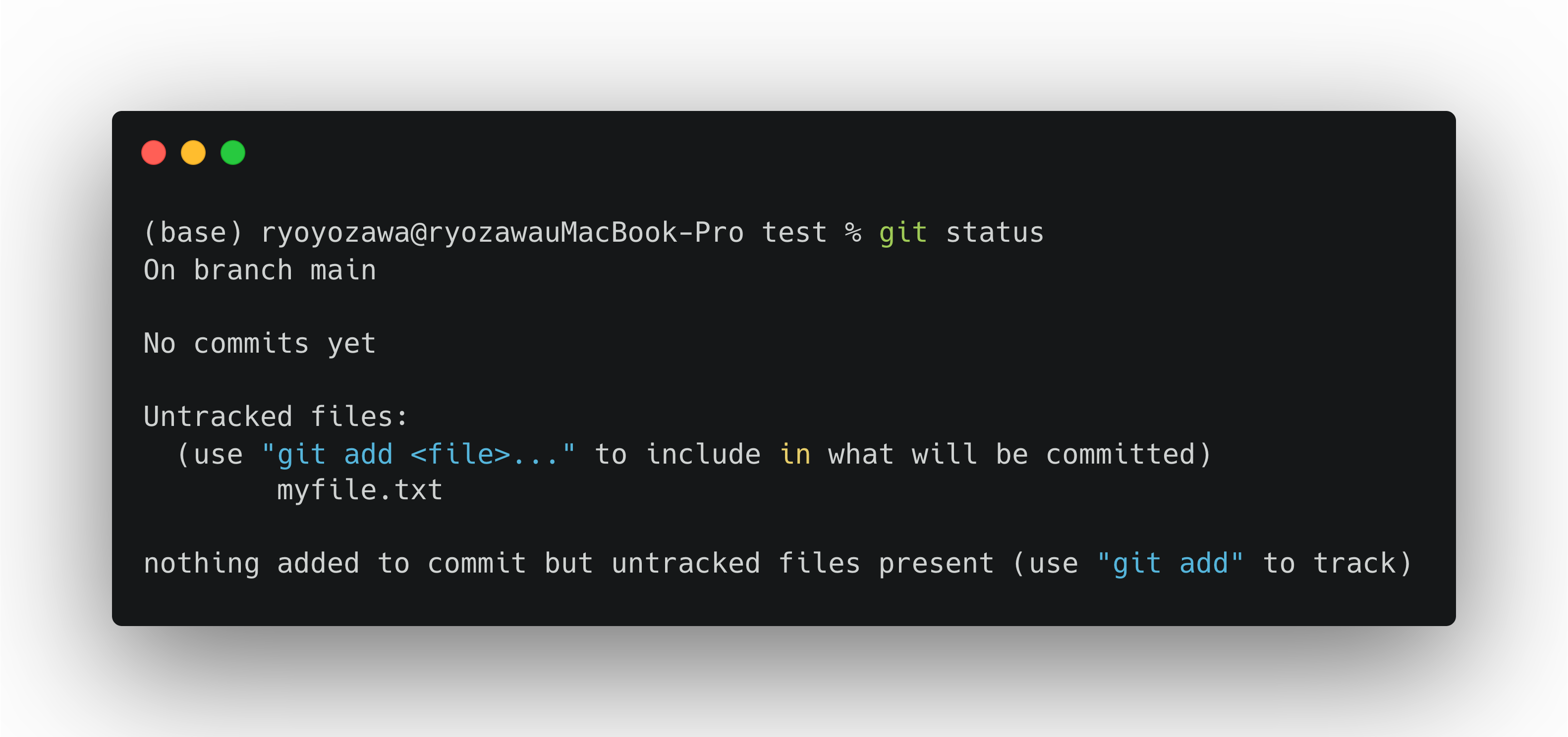 git statusというコマンドでステータスを確認すると、myfile.txtはUntracked fileであり、つまり、また追跡対象になっていないです。