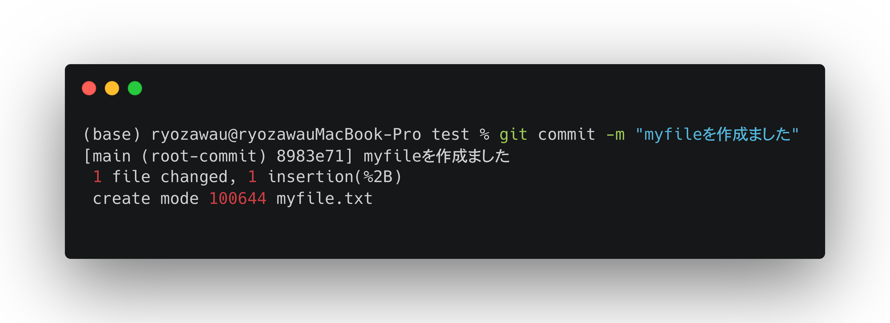 git commitというコマンドを使います。コミットをする際、コミットの内容を説明するメッセージを記入する必要があります。-mというオプションを付加して、その後メッセージを入れましょう。例えば、